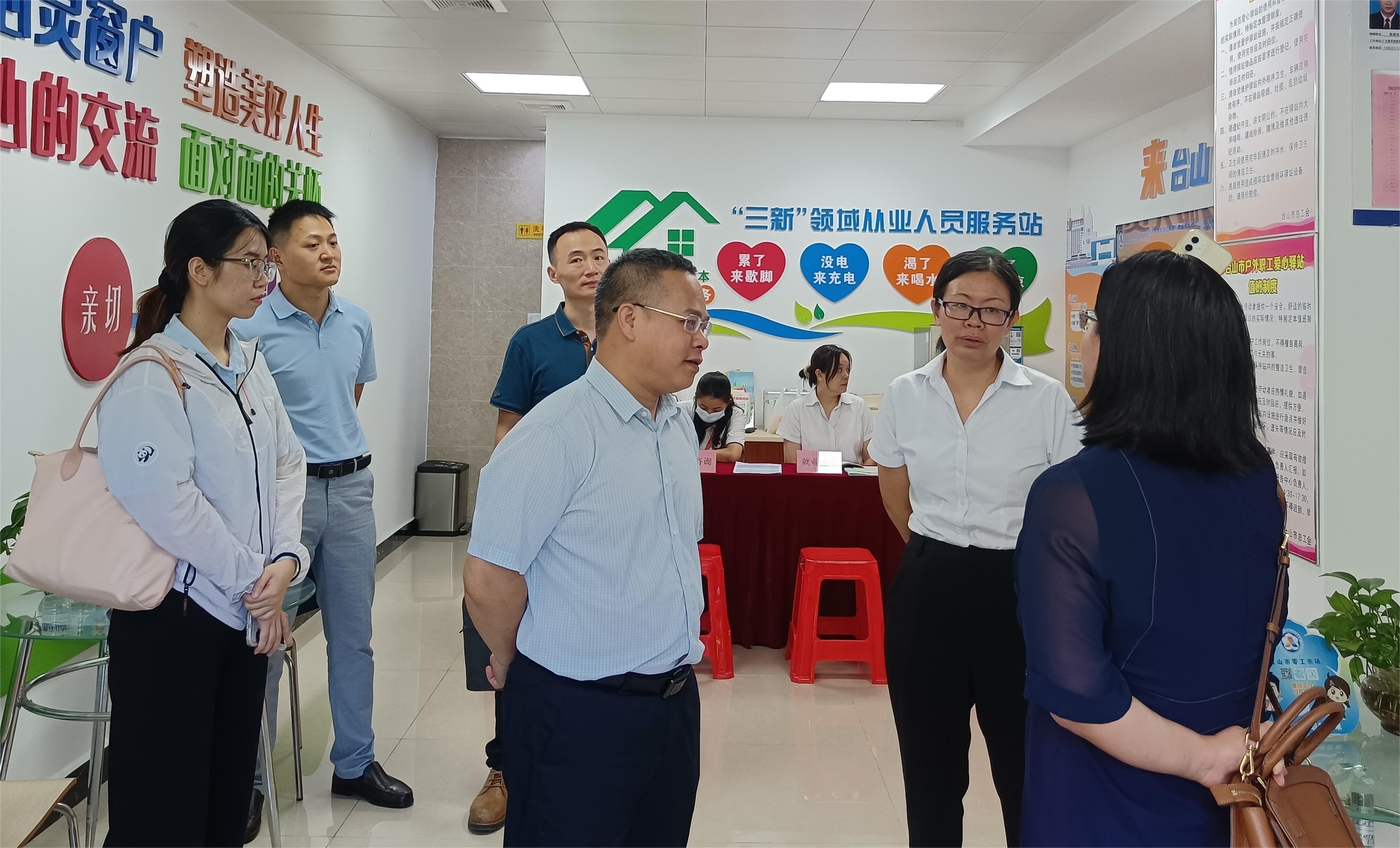 調研組一行走進臺山市零工市場,參觀政策咨詢區、招聘專區、法律咨詢區等功能區域,聽取臺山市首個零工市場建設、運營及服務項目開展情況的介紹。對臺山人社局聯合市總工會整合資源,共同搭建零工市場服務新業態從業人員的創新舉措表示肯定。