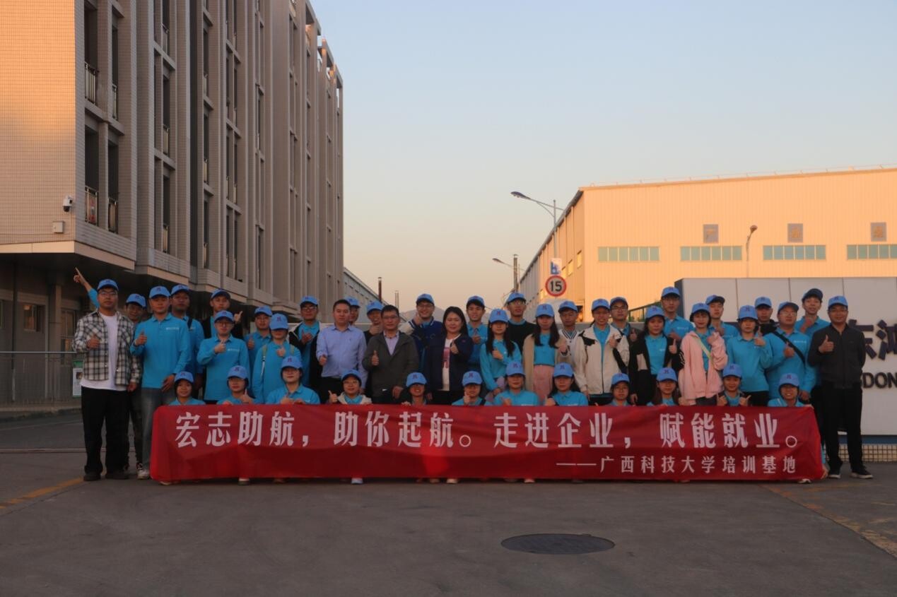接著先后前往臺山市工業新城管理委員會、臺山市松田電工(臺山)有限公司、廣東鴻特精密技術(臺山)有限公司、臺山市冠興金屬有限責任公司、臺山市金橋鋁型材廠有限公司、臺山市廣生家居用品有限公司、廣東玫瑰島衛浴科技有限公司等重點企業參觀調研,對各企業的展廳、生產車間、實驗室等進行參觀,了解各種產品生產流程和數智化的設施設備。在參觀期間,企業相關負責人向廣西科大的師生介紹員工的工作時長、薪酬待遇、假期保障、生活環境等情況。校企雙方也一邊交流探討學生頂崗實習、見習就業和企業技術創新和生產運用等方面的合作意向。