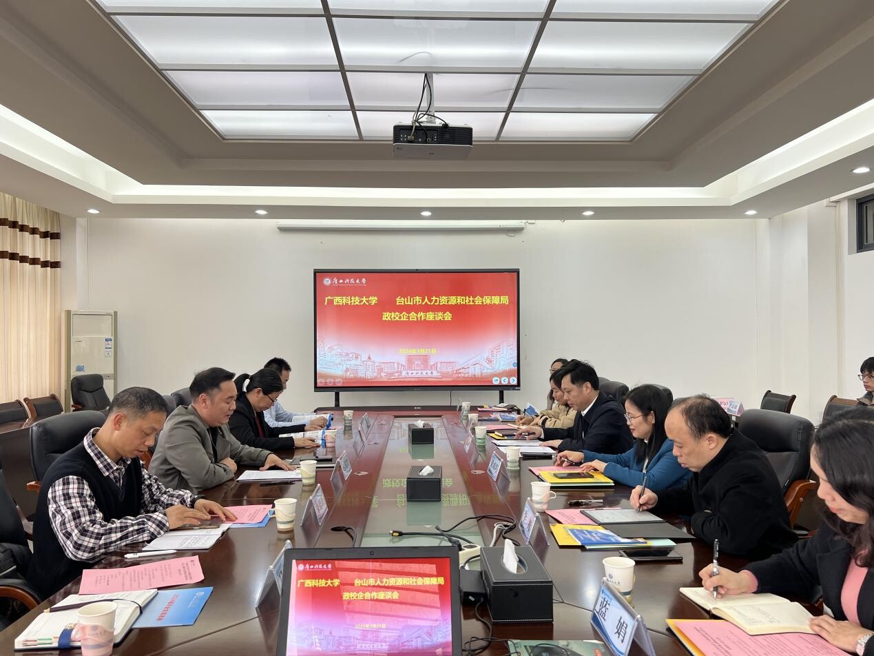 為鞏固深化臺山市與廣西科技大學人才供給合作,賡續校地合作初心,共推人才引進和學生就業共贏。3月21日,臺山市人社局率隊前往廣西科技大學開展政校企座談,市人社局黨組書記、局長趙湖濱,黨組成員、副局長肖雄英,廣西科技大學學生工作部(處)部(處)長陳克文,副部(處)長鄧建春等相關學院領導老師以及臺山市企業代表出席活動。