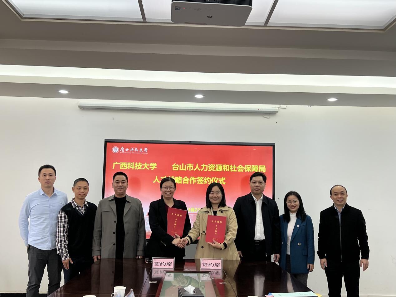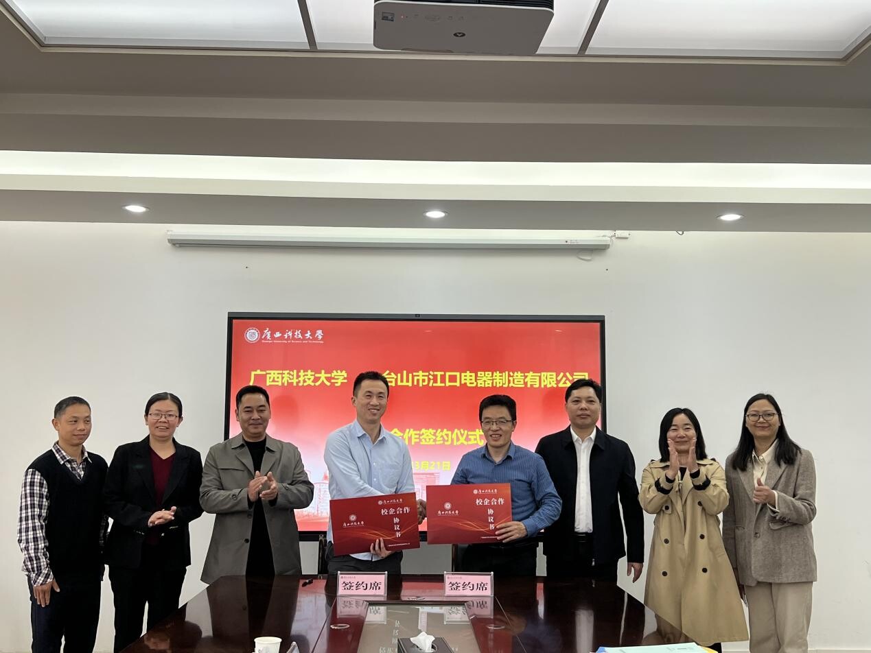 隨后,臺山市人社局與廣西科技大學簽署《人才戰略協議》,江口電器與廣西科技大學簽訂《校企合作協議》。