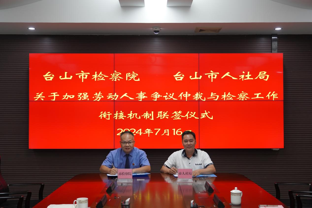 為貫徹黨中央關于健全社會矛盾糾紛多元預防調處化解綜合機制的要求,推進檢察工作進一步發展,促進勞動人事爭議仲裁工作平穩高效運行,切實保障勞動者特別是農民工等弱勢群體合法權益,維護社會和諧穩定。7月16日,臺山市人民檢察院與臺山市人社局聯合印發《關于加強勞動人事爭議仲裁與檢察工作銜接的意見》(以下簡稱《意見》)并舉行銜接機制聯簽儀式。臺山市人民檢察院副檢察長石羨迎、第四檢察部主任陳小雄、第四檢察部副主任邱星新,臺山市人社局局長趙湖濱、法制股股長杜承甫、仲裁院負責人黃嘉文等參加儀式。