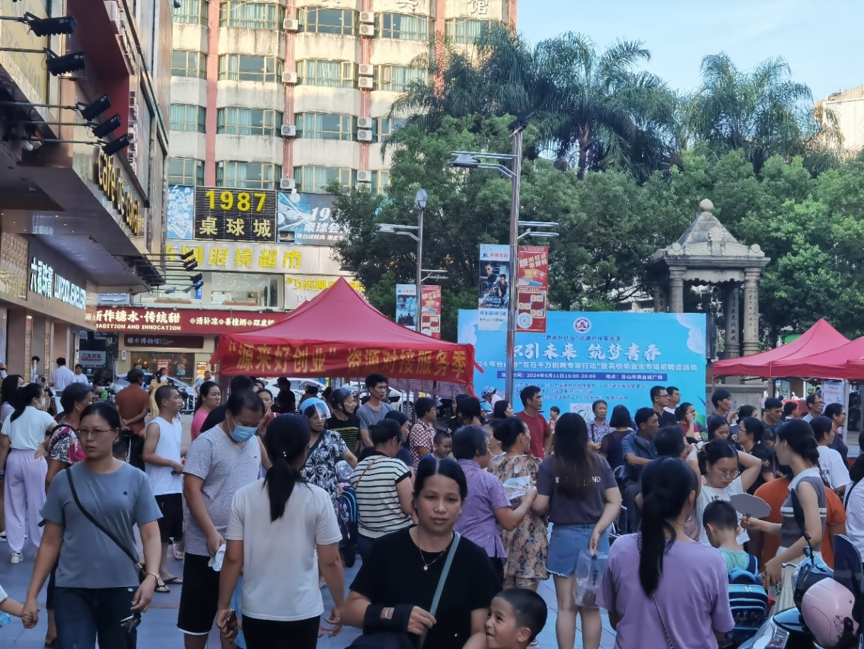 9月11日,臺山市人力資源和社會保障局在臺山市商業城中心區域及線上平臺同步舉辦了一場2024年臺山市“百日千萬招聘專項行動”暨高校畢業生專場招聘會活動—商業城專場。此次活動結合了線上直播帶崗與線下招聘會兩種形式,旨在進一步拓寬就業服務渠道,為高校畢業生等重點群體提供更加便捷、高效的求職機會,同時有效緩解企業用工難題。
