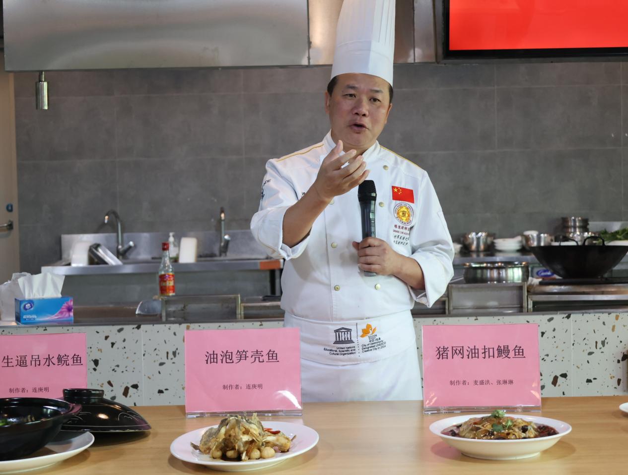 本次活動在市人力資源和社會保障局指導下,由臺山市技工學校邀請順德職業技術學院、順德廚師協會到校進行交流研發。順德職業技術學院烹飪學院黨總支書記董國順帶領烹飪專業教師麥盛洪、順德廚師協會會長連庚明和臺山市烹飪協會會長陳本領、臺山市技工學校“粵菜師傅”技能大師工作室領銜人等共同交流淡水魚烹飪技藝,聯合發布了砂鍋生逼吊水鯇魚、油泡筍殼魚、豬網油扣鰻魚、雞油鹽油蒸鯽魚、鮑汁蒸魚片、黑松露汁焗鳙魚、怪味鯪魚滑等共8個淡水魚菜式。