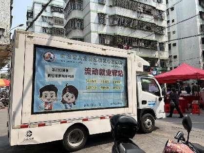 此次活動配備了流動驛站服務(wù)車,車上裝有LED信息顯示屏和廣播系統(tǒng),實時滾動展示臺山市零工市場、就業(yè)驛站各站點的地址、服務(wù)功能,以及企業(yè)招聘崗位信息和就業(yè)創(chuàng)業(yè)政策。