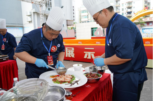 本次競賽共設四個項目,要求參賽選手在規定時間內,運用粵菜烹飪技法,選用鰻魚、三黃雞、桂花魚和大花蝦作主料為指定原料分別制作4道宴席主菜肴的菜式,共4個作品,體現本地的飲食風味。活動現場,參賽選手們熱情高漲,積極參與,憑借精湛的烹飪技藝,巧妙地將傳統粵菜烹飪手法與現代創新理念相結合,將競賽食材制作成一道道色香味俱全、造型精美的佳肴,它們是粵菜文化、粵港澳飲食文化傳承與創新的生動載體,充分展現了粵菜烹飪的獨特魅力和深厚文化底蘊。