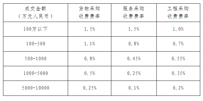 (一)收費標準:實際代理服務費=成交金額×基準收費費率×(成交折扣率),基準收費費率以《國家計委關于印發招標代理服務收費管理暫行辦法的通知》(計價格〔2002〕1980號)《國家發展改革委關于降低部分建設項目收費標準規范收費行為等有關問題的通知》(發改價格〔2011〕534號)文件為標準,按差額定率累進法計算收取,即: