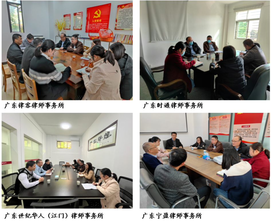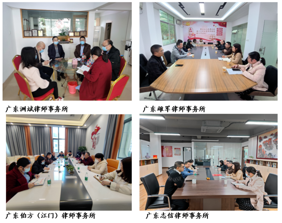 走訪中,調(diào)研組詳細(xì)了解各律師事務(wù)所內(nèi)部管理、業(yè)務(wù)開(kāi)展、職業(yè)道德、誠(chéng)信執(zhí)業(yè)和隊(duì)伍建設(shè)等情況,聽(tīng)取各律所負(fù)責(zé)人的年度工作計(jì)劃。同時(shí),調(diào)研組就各律師所去年工作存在的共性問(wèn)題如案件報(bào)備、律所報(bào)表報(bào)送、參與公益法律服務(wù)以及一村(社區(qū))一法律顧問(wèn)工作等情況提出整改要求。調(diào)研組強(qiáng)調(diào),各律所要?jiǎng)?chuàng)新宣傳方式,線(xiàn)上線(xiàn)下協(xié)同發(fā)力舉辦學(xué)習(xí)貫徹黨的二十大精神等專(zhuān)題教育培訓(xùn)班,切實(shí)提升廣大律師的政治覺(jué)悟和理論水平,鼓勵(lì)律師申請(qǐng)入黨,壯大我市黨員律師隊(duì)伍。