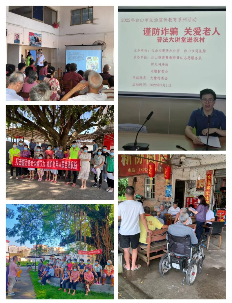 陳煥年、官子謙、趙崇烈、許法人、易子文等多位臺山駐村(社區)律師積極走訪服務轄區村(居)民小組,采取登門入戶宣講、發放宣傳資料等方式進行線索排查,了解老年人需求,耐心分析各類詐騙的慣用手段、作案方式和特點,講解防范常識,開展精準養老詐騙法治宣傳。