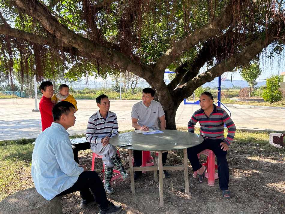 圖為梁劍敏在聯和南溪村就出租耕地問題聽取村民意見建議