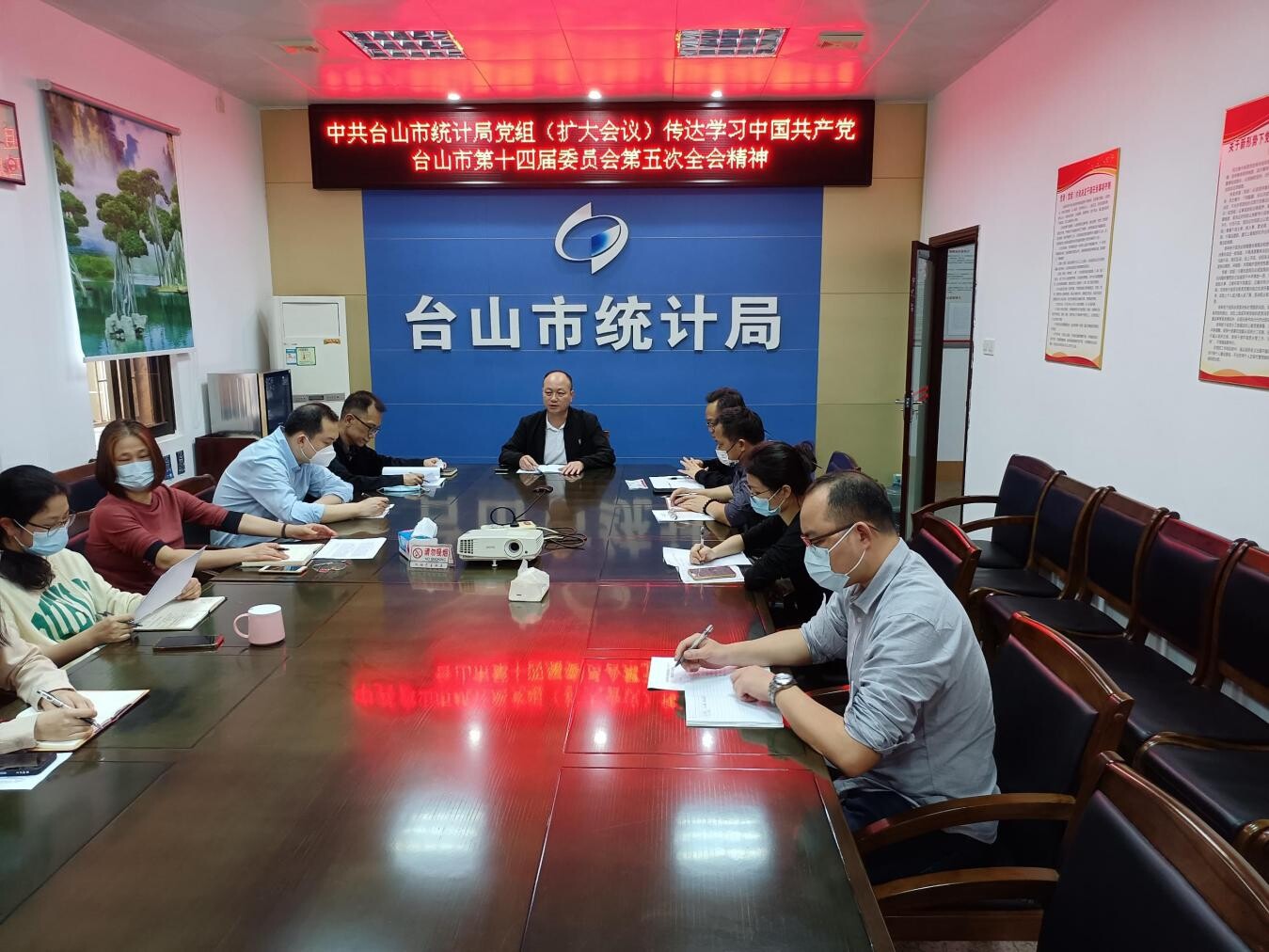 2月10日,臺山市統計局召開黨組(擴大)會議,專題傳達學習市委十四屆五次全會精神,局黨組書記、局長主持會議,局班子成員、各股室負責人參加會議。