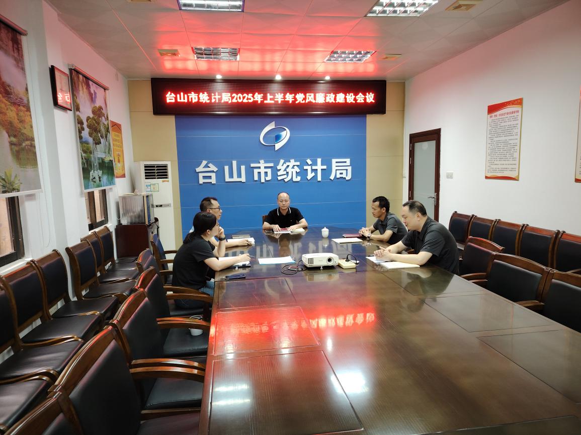 近日,臺山市統計局召開2025年上半年黨風廉政建設專題會議。局黨組書記、局長黃衛松主持并講話,市紀委監委第七派駐紀檢監察組組長梁裕鋒到會指導,局全體班子成員參加會議。