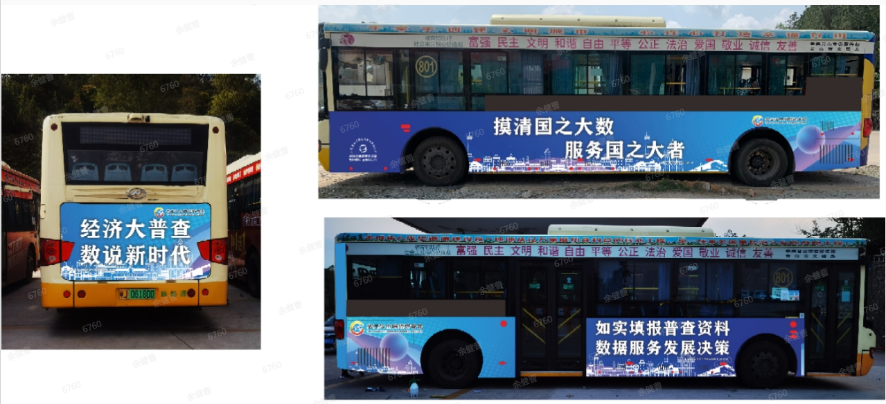 二是聚焦重點區域,集中力量宣傳。一是在人流量密集、企業聚集的工業區、批發市場、大型綜合商業體等重點地區張貼經普宣傳海報和發放宣傳單張;二是在臺城街道辦和水步鎮等地區的重要交通路口和路段投放大型戶外廣告3幅;三是選取全市普查對象較多的主要交通路線(801和802公交車),通過戶外車身廣告進行移動宣傳。