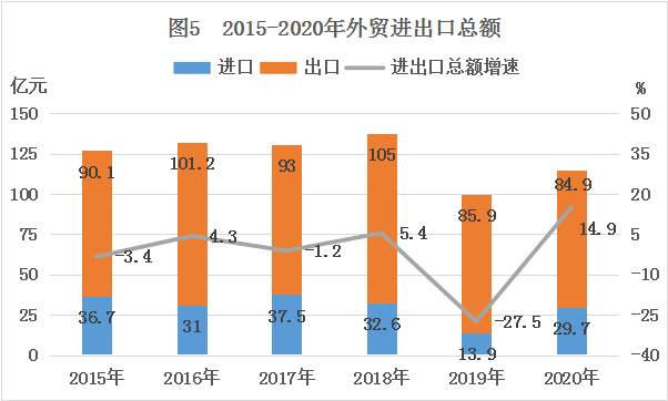 全年外貿進出口總額114.61億元,比上年增長14.9%。其中,進口總額29.7億元,增長113.9%;出口總額84.9億元,下降1.1%。全年實際利用外資4542萬美元,下降70.1%。