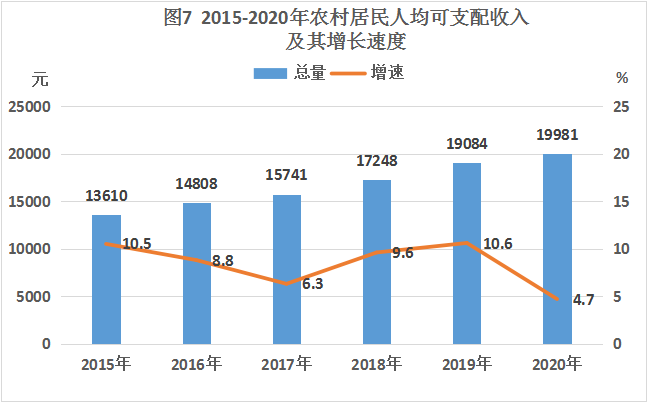 全年農村居民人均可支配收入19981元,比上年增長4.7%。