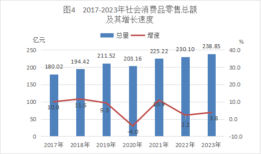 全年社會消費品零售總額238.85億元,比上年增長3.8%。其中:按規模統計,限額以上社會消費品零售額37.52億元,下降2.8%;限額以下社會消費品零售額201.33億元,增長5.1%。