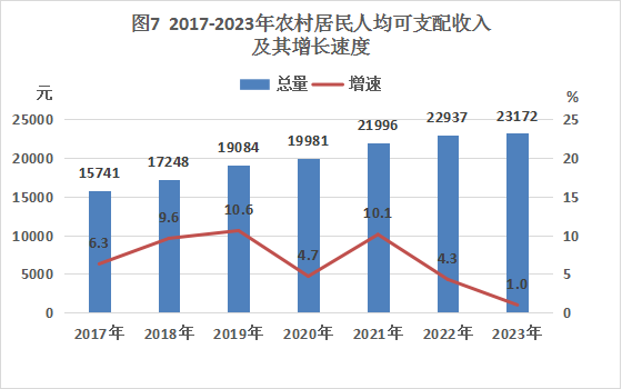全年農村居民人均可支配收入23172元,比上年增長1.0%。