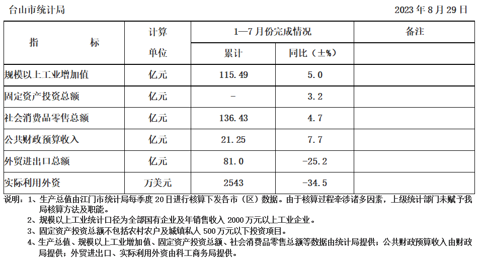臺(tái)山市2023年1-7月主要經(jīng)濟(jì)指標(biāo)完成情況