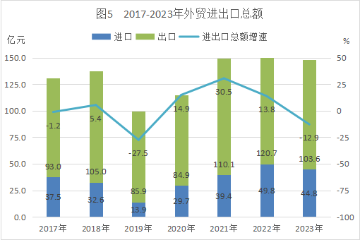 全年外貿進出口總額148.4億元,比上年下降12.9%。其中,進口總額44.8億元,下降10.0%;出口總額103.6億元,下降14.1%。全年實際利用外資3222萬美元,下降54.7%。