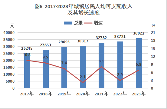 全年城鎮居民人均可支配收入36022元,比上年增長6.8%。