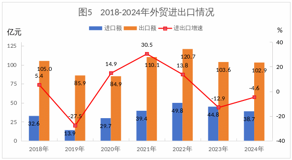 全年外貿進出口總額141.6億元,比上年下降4.6%。其中,進口總額38.7億元,下降13.6%;出口總額102.9億元,下降0.6%。全年實際利用外資2964萬美元,下降8.0%。