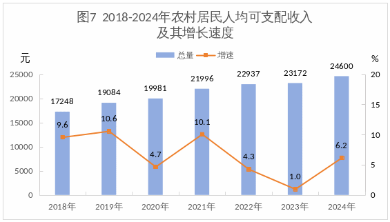 全年農村居民人均可支配收入24600元,比上年增長6.2%。
