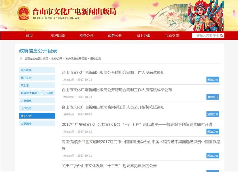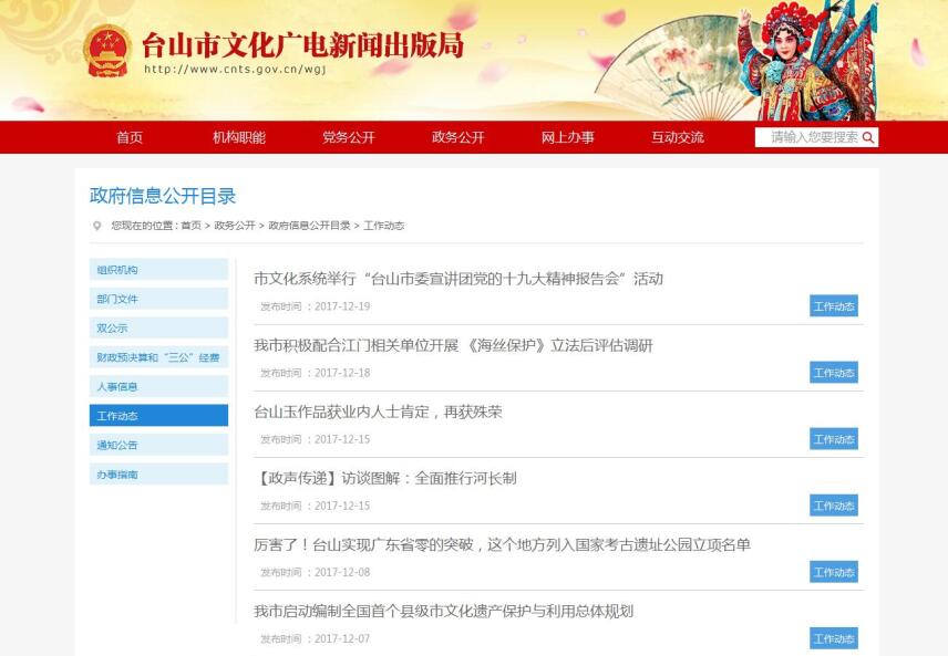 2017年,臺山市文化廣電新聞出版局認真貫徹落實《中華人民共和國政府信息公開條例》文件精神,圍繞政府信息公開工作,加強組織領導,完善工作機制,加大工作力度,豐富信息內容,有力推動了我市文化政務信息公開工作的開展。