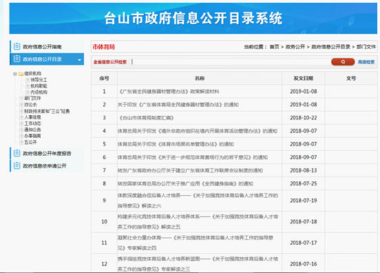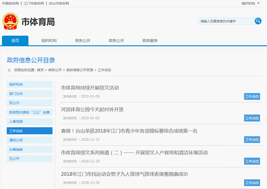 (二)加強信息公開力度。一是做好預決算公開內容,嚴格按市財政局的要求在規定時間里做好市體育局2017年的決算公開與2018年的預算公開工作。二是進駐廣東政務服務網(原網上辦事大廳)的體育部門審批事項不斷完善辦理流程。三是主動通過官方網站、微信公眾號、官方微博等多平臺多渠道發布2018年舉辦的相關比賽活動相關信息,方便群眾關注了解臺山體育發展現狀。