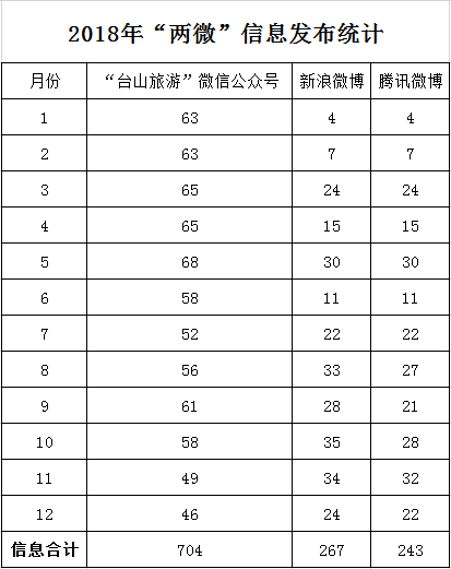 (一)網絡平臺信息公開。2018年度,我局通過政府信息公開平臺主動向社會公開政府信息261條,通過“臺山旅游”微信公眾號發布信息704條、兩個微博(新浪、騰訊)發布信息510條,有效推動的旅游信息公開工作。