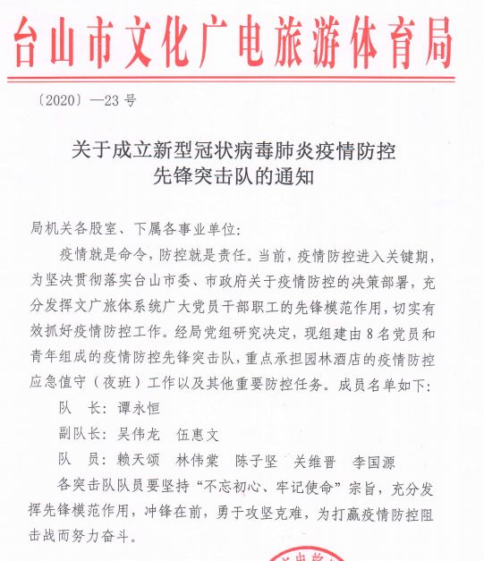 庚子新春,新冠肺炎疫情牽動(dòng)國(guó)人之心。在市委、市政府的正確領(lǐng)導(dǎo)下,臺(tái)山市文廣旅體局黨組始終堅(jiān)持“疫情就是命令,防控就是責(zé)任”要求,積極發(fā)揮共產(chǎn)黨員的先鋒模范作用,文旅體領(lǐng)域涌現(xiàn)出了黃超峰、袁昕華、陳健忠等一批先進(jìn)個(gè)人,他們不畏艱險(xiǎn),勇于奔赴工作一線,為全市防控工作做出了應(yīng)有貢獻(xiàn)。