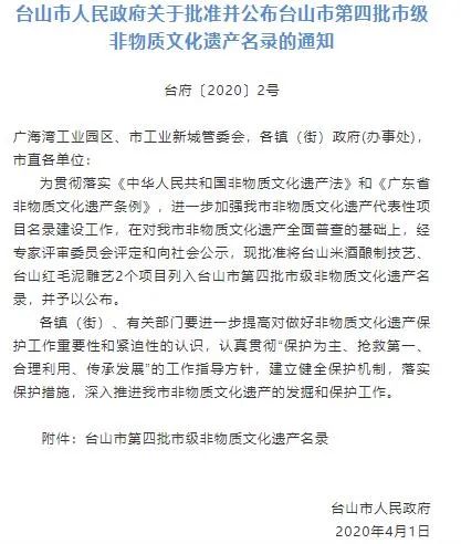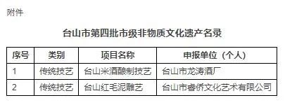 日前,我市政府網發布了臺山市第四批市級非物質文化遺產名錄,他們分別是臺山米酒釀制技藝、臺山紅毛泥雕藝!