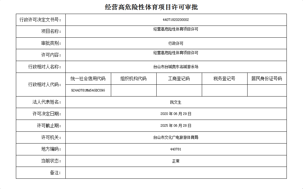 經營高危險性體育項目許可審批-臺山市臺城奧東名城游泳場