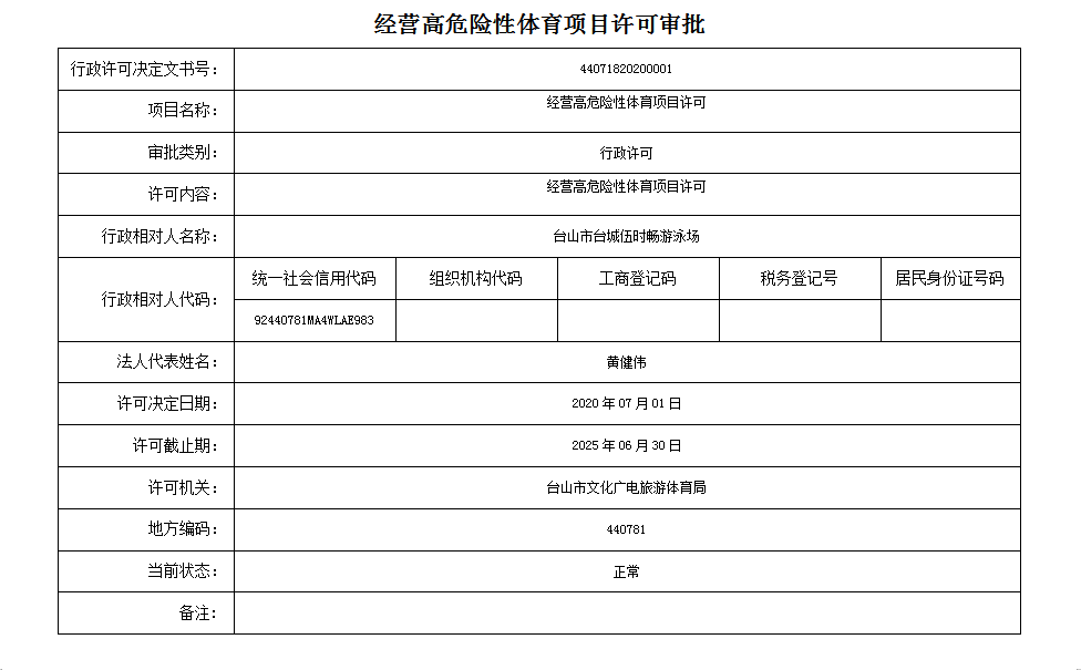 經營高危險性體育項目許可審批-臺山市臺城伍時暢游泳場