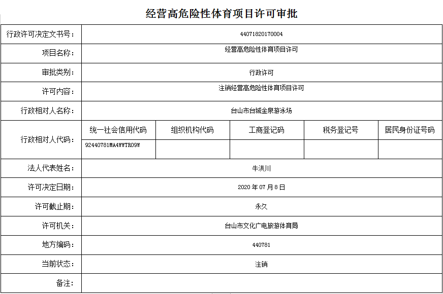 注銷經營高危險性體育項目許可審批-臺山市臺城金泉游泳場