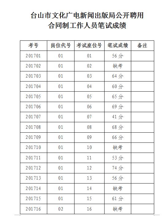 根據《臺山市文化廣電新聞出版局公開聘用合同制工作人員的公告》,今年我局面向社會聘用合同制工作人員3名,經現場報名、資格審核等程序,符合資格條件23人。10月19日上午已完成本次公開聘用合同制工作人員筆試,現將筆試成績予以公布。