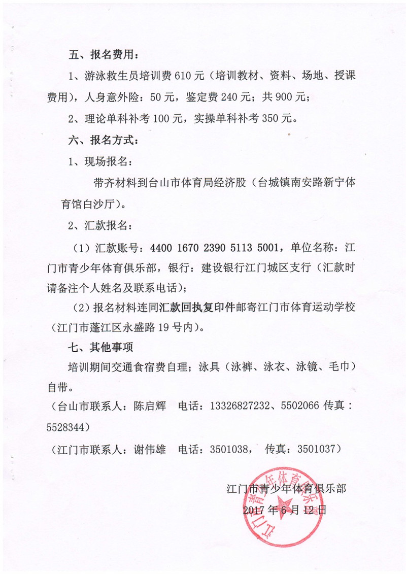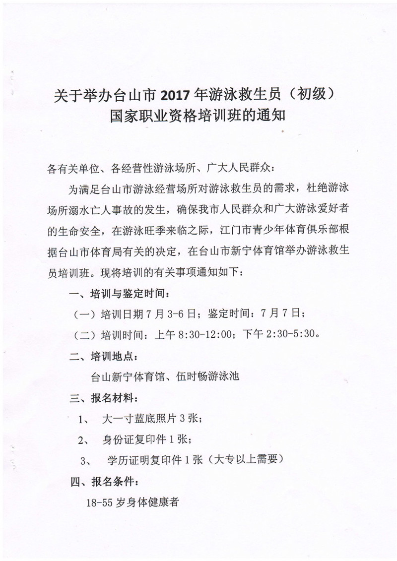 關于舉辦臺山市2017年游泳救生員(初級)國家職業資格培訓班的通知