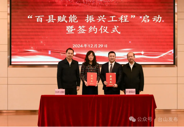 12月29日,“百縣賦能振興工程”臺山市啟動暨簽約儀式在臺山市衛生健康局舉行。“百縣賦能振興工程”辦公室主任汪輝,“百縣賦能振興工程”辦公室常務副主任陳順俊,臺山市委書記鄭勁龍,臺山市政府副市長靈君出席活動。