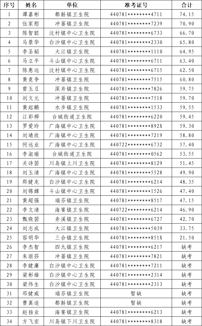 (四)杜絕缺考現(xiàn)象。本次考試有10名考生缺考,缺考占比高達26.47%(9/34),而缺考理由較為敷衍,未經(jīng)本單位審核批準。請有關鎮(zhèn)(街)衛(wèi)生院加強考生教育,積極參與復習和考試工作。對于缺考2次的考生,將列入黑名單,不再予以報名本級舉辦的鄉(xiāng)村醫(yī)生實踐技能和綜合理論考試。
