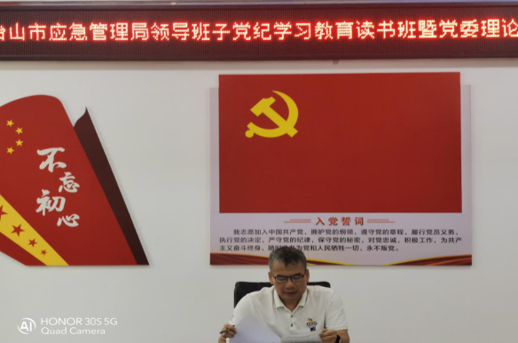 5月30日,臺山市應急管理局領導班子舉行黨紀學習教育讀書班,同時套開黨委理論學習中心組學習會,深入學習貫徹習近平總書記關于黨紀學習教育的重要講話和重要指示精神,圍繞新修訂的《中國共產黨紀律處分條例》進行學習,同時與學習習近平總書記關于黨的建設的重要思想、關于黨的自我革命的重要思想以及《中國共產黨章程》貫通學習,帶動全局黨紀學習教育走深走實。臺山市應急管理局黨委書記、局長黃灼熾主持讀書班集體研討環節,全體領導班子成員參加讀書班。