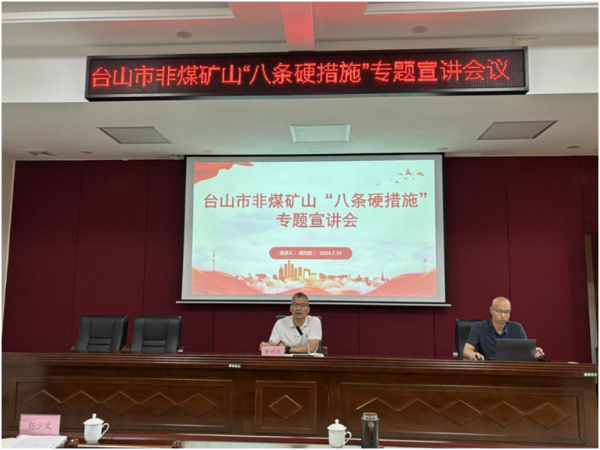 2024年7月31日,臺山市應急管理局在組織收聽收看廣東省礦山“八條硬措施”專題宣講視頻會議后,召開本市推進非煤礦山企業“八條硬措施”專題宣講會議,會議傳達臺山市落實《國務院安全生產委員會關于防范遏制礦山領域重特大生產安全事故的硬措施》任務分工方案相關精神,對我市非煤礦山行業安全生產形勢進行了研判分析,部署非煤礦山企業下階段責任任務,礦山和危化監管股、各礦山企業主要負責人及安全管理人員共24人參加此次會議。
