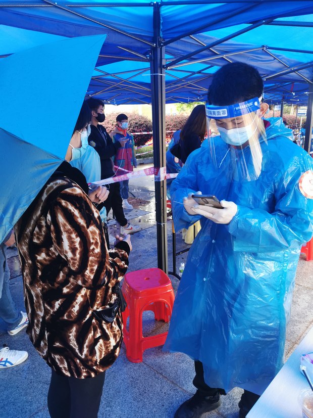 雨水淅淅瀝瀝,石化山全民核酸檢測點,市住建局志愿者們披著雨衣不懼寒冷的風雨仍堅守在自己的崗位上,積極耐心引導群眾有序排隊,維護隊伍排隊秩序,幫助老年群眾使用智能手機將信息輸入生成核酸采樣二維碼,進一步加快核酸檢測采樣速度,自覺配合現場醫務人員的工作,確保各個環節閉環相連,高效保質。