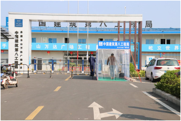 ▲萬達廣場項目已配備好口罩、消毒酒精、測溫槍等防控物資,并設有消毒通道