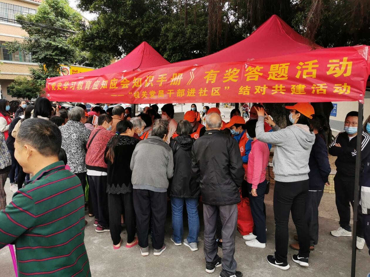 本次活動是以現場抽取題目答題的形式開展,主要圍繞黨史、黨建等知識出題,設置了啟蒙級、入門級以及終極級三個類別的題目,難度逐級遞進、學習逐步深入,進一步加深了黨員干部和社區群眾對百年黨史的認識。此外,黨員干部們還向社區群眾居民派發《黨史學習教育應知應會知識手冊》,為他們普及黨史學習教育相關知識。現場氣氛活躍,人頭攢動,十分熱鬧,社區群眾踴躍參與了此次活動,并表示在此次中收獲良多。
