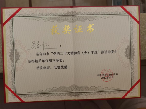 吳志仁同志代表我局參加決賽。通過前期認真準備,刻苦訓練,吳志仁同志沉穩應戰,以對話2049年的自己為形式,回望建黨百年的崢嶸歲月,展望新中國成立百年的空前盛況,深情傾訴,娓娓道來,展現了住建青年深厚的家國情懷。最終吳志仁同志獲得三等獎的優秀成績。我局獲得“優秀組織單位獎”。
