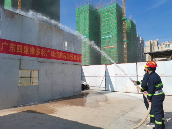 ▲現場應急救援隊伍攜帶水泵對模擬火場進行滅火