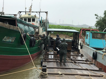 (漁政人員在橫山漁港接駁漁船從業(yè)人員上岸避風)
