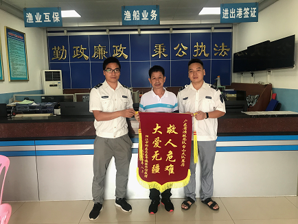 8月20日,一名陽江漁民專程來到臺山漁政大隊川島中隊,將一面繡著“救人危難 大愛無疆”的錦旗贈予臺山漁政大隊,感謝其熱心救援!