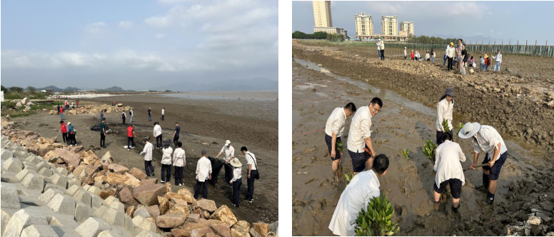 下午,黨員志愿者一行前往廣海漁港灘涂開展“海上植樹”活動。志愿者們在清理完海灘垃圾后,脫下鞋襪、挽起衣袖,手捧紅樹幼苗,迫不及待地走向植樹區域。志愿者們腳踩淤泥,揮鍬鏟土、扶苗填坑,有條不紊地給原本灰蒙蒙的灘涂增添一抹抹鮮綠,他們忙碌穿梭的身影在陽光的照射下形成了一道道靚麗的風景。