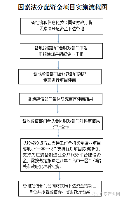 第十六條 因素法分配資金,由珠江西岸“六市一區”和韶關市按照省財政扶持政策,下發申報通知,組織申報、審核、評審和實施,并將具體項目安排計劃報省經濟和信息化委、省財政廳備案。