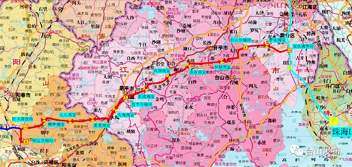 粵西天然氣主干管網陽江——江門干線項目,全長170.3公里,管徑813毫米,設計壓力9.2兆帕,設計輸量為26.85億立方米/年;項目總投資為30多億元。管道選址整體由西向東鋪設,線路起于陽江市江城區,途經陽東、恩平、開平、臺山、新會,終點位于新會雙水鎮,共設置5座站場、9座閥室。其中,臺山線路東連新會,西接開平,長約32.2公里,在臺山與新會交界處設臺山分輸站1個,在臺城設閥室1座。