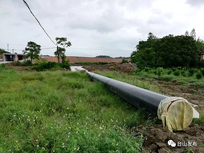 目前,該項目正在全面鋪開。在中開高速公路項目的工地旁邊,可以看到沿線整齊擺放著大量黑色的管道,這些黑色管道是粵西天然氣主干管網陽江——江門干線項目的管道。為節省用地,項目規劃部分線路與中開高速重疊,其中臺山段大部分都沿著中開高速公路旁邊建設。